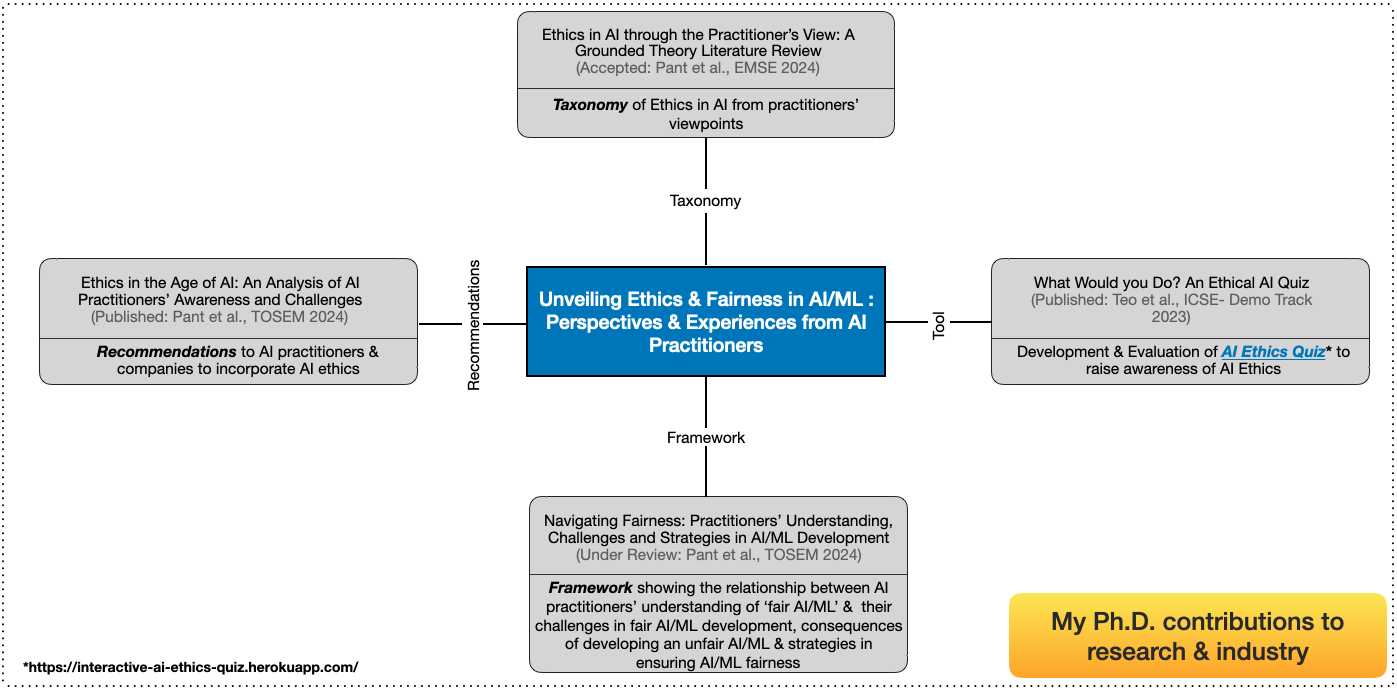 In my research, I employed mixed-method approaches to delve into AI practitioners' perceptions of AI ethics and their experiences in developing ethical AI-based systems. Using the Grounded Theory Literature Review, I developed a comprehensive taxonomy of AI ethics from practitioners' perspectives, offering insights into the key challenges they encounter in developing ethical AI-based systems. I investigated industry perspectives on AI practitioners' awareness of AI ethics, the challenges in fostering ethical AI-based systems, and their comprehension of fairness in AI/ML systems, along with the associated challenges and strategies for ensuring fairness. An interactive Ethical AI Quiz was also developed and assessed as part of my Ph.D. project to raise awareness of AI ethics among practitioners. The findings of my Ph.D. project can be found in publications across venues like Transactions on Software Engineering and Methodology (TOSEM), Empirical Software Engineering (EMSE), and the International Conference on Software Engineering (ICSE).